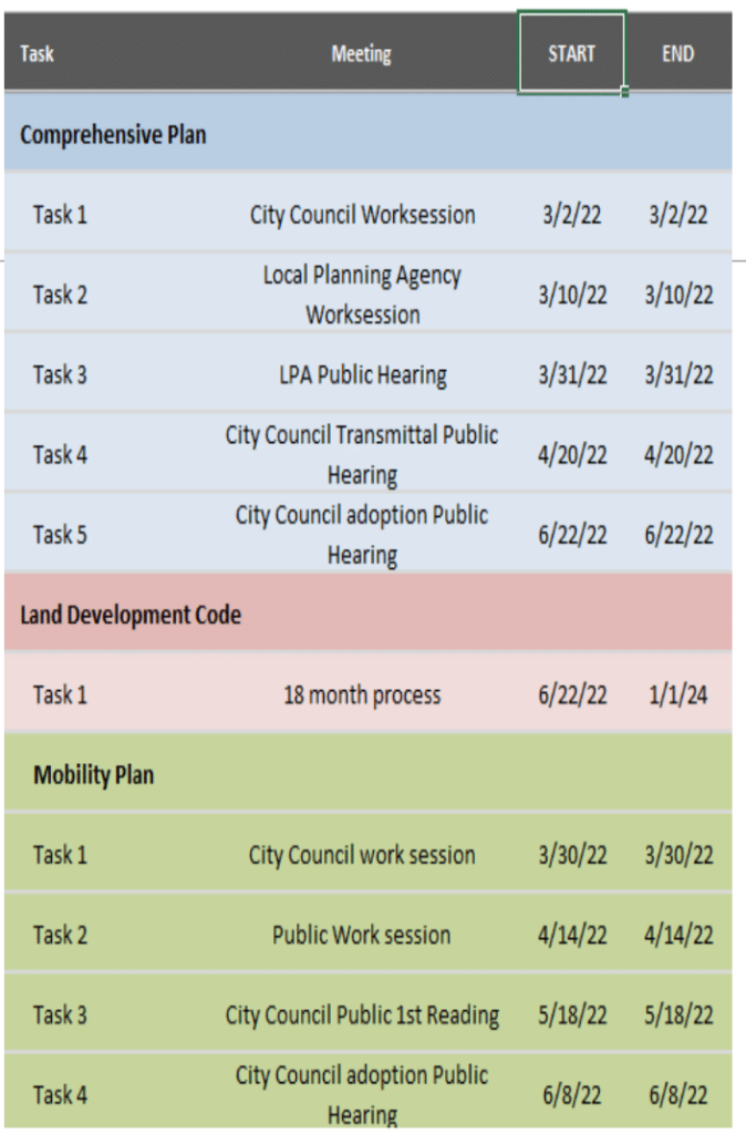 The city hosted four virtual visioning sessions that invited public input in early 2021. Only about 15-20 residents attended each of those sessions. That input, combined with city data, formed a plan draft that will first be workshopped by the Local Planning Agency board and the Council and then approved by each board. Once approved, it will go to the state for a first approval then back to Council for a second approval and then back to the state for a final approval.