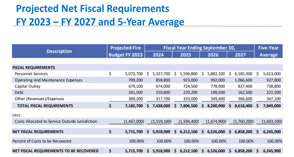The fee is projected to collect $3.7 million in the first year. That’s $1.6 million less than the $5.3 million projected 2023 fire department budget for service within city limits. The total projected fire department budget for 2023 is $7.2 million, which includes services provided outside of city limits, which cannot be included in the fee.