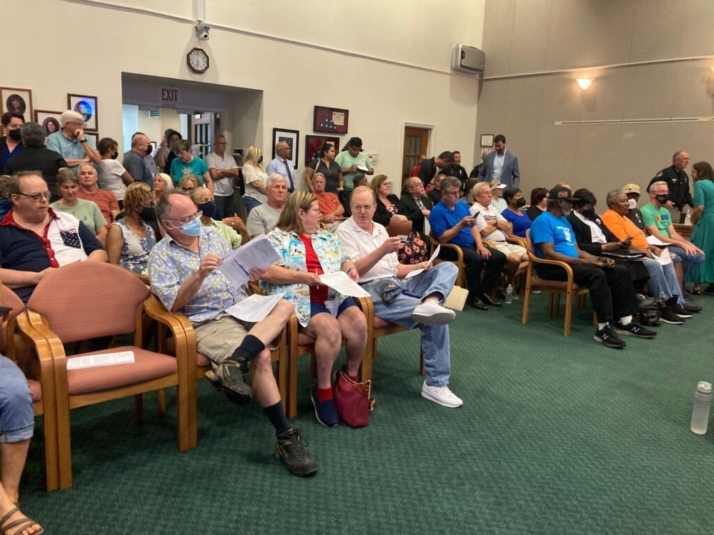 The standing-room-only meeting spilled into the City Hall lobby and onto the front porch where a television was rolled out so people could watch the meeting outside.