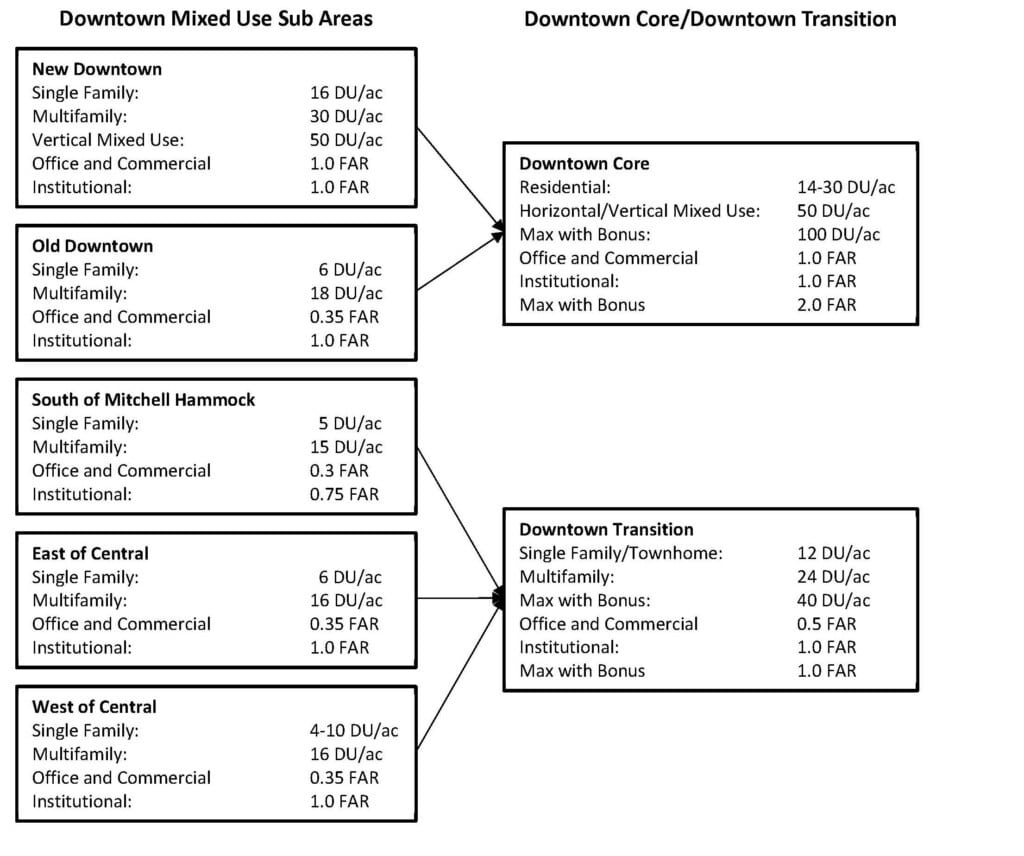 The new downtown area already had a similar density in the 2010 plan, when the city was planning for its 38,000 population to increase to 49,000 in 2025. But the plan update increased Oviedo’s historic downtown density from a maximum of 18 dwelling units per acre. The Marketplace increased from a maximum of 5.5 dwelling units per acre and the Gateway West Core changed from a mix of office land use with a maximum of 8 dwelling units per acre and commercial, with a maximum of 15 dwelling units per acre.