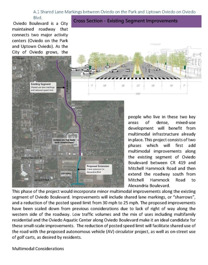 The mobility plan includes shared bike and motor vehicle lanes down the stretch of Oviedo Boulevard that connects Oviedo on the Park and the historic downtown. The LPA recommended increased safety measures, including definitive signs along the lanes signaling that they’re shared.