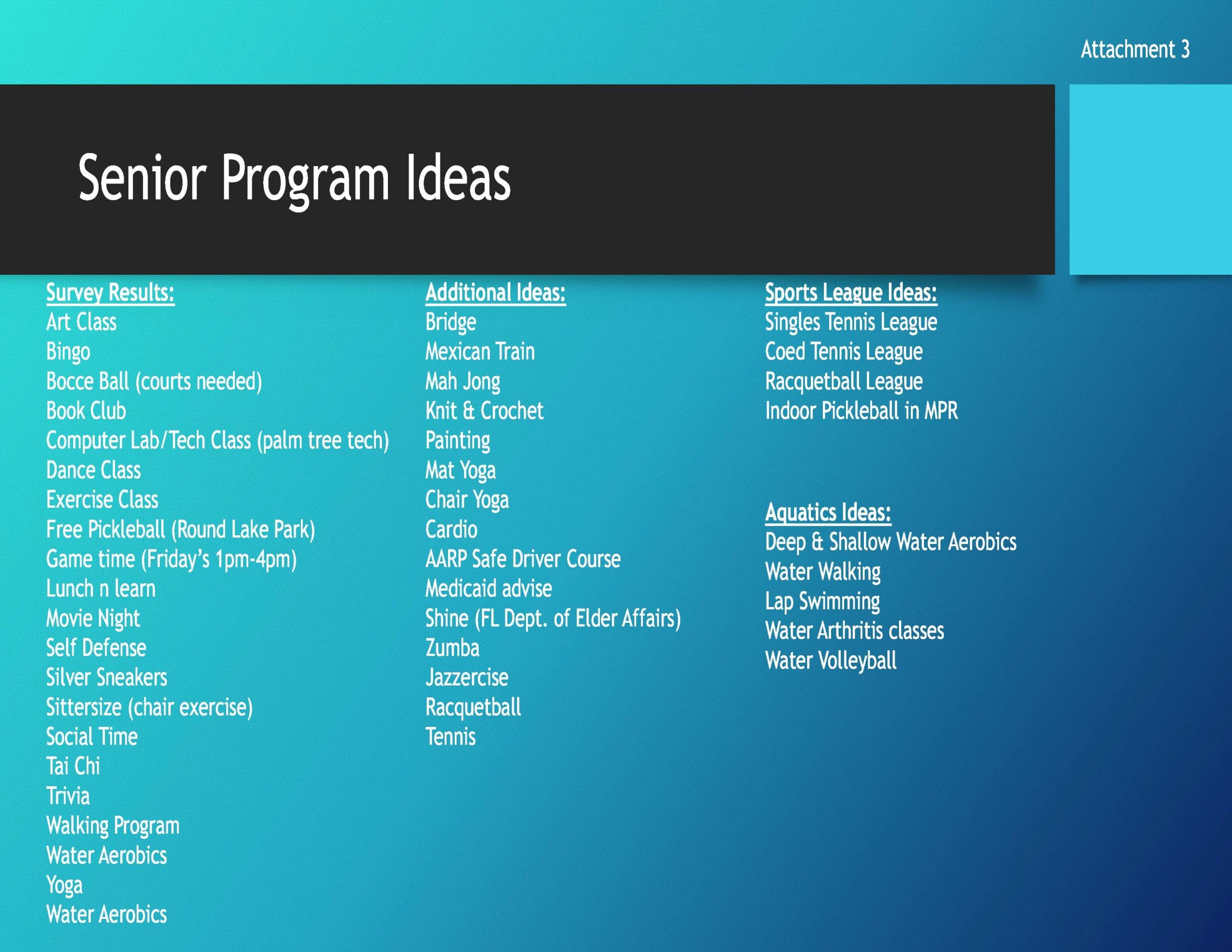 Current senior programming by the city consists of Senior Game Time, Senior Book of the Month Club and Senior Field Trips. During a July 7 meeting, staff reported that only about six to 15 seniors participate in the book club, and only four signed up for a recent field trip, which was a tour of the St. Johns River.