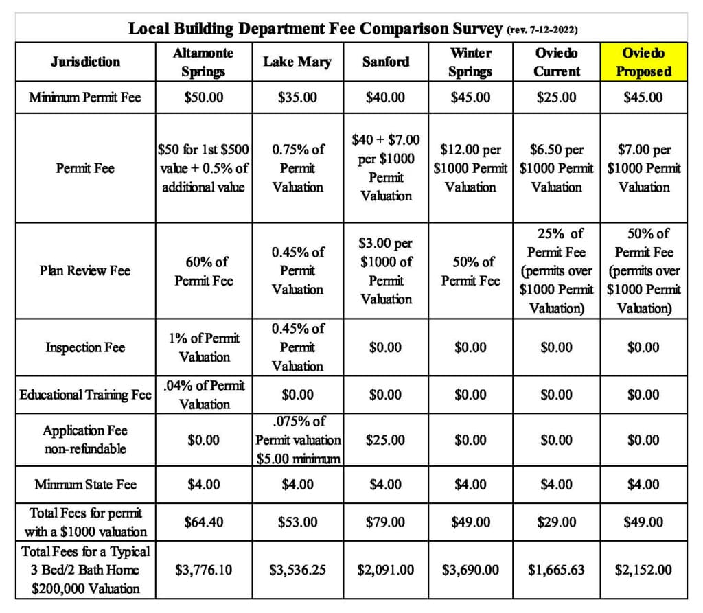 Here’s a description of the fees and a comparison the staff created of Oviedo’s proposed fees and the fees other cities in Seminole County charge.