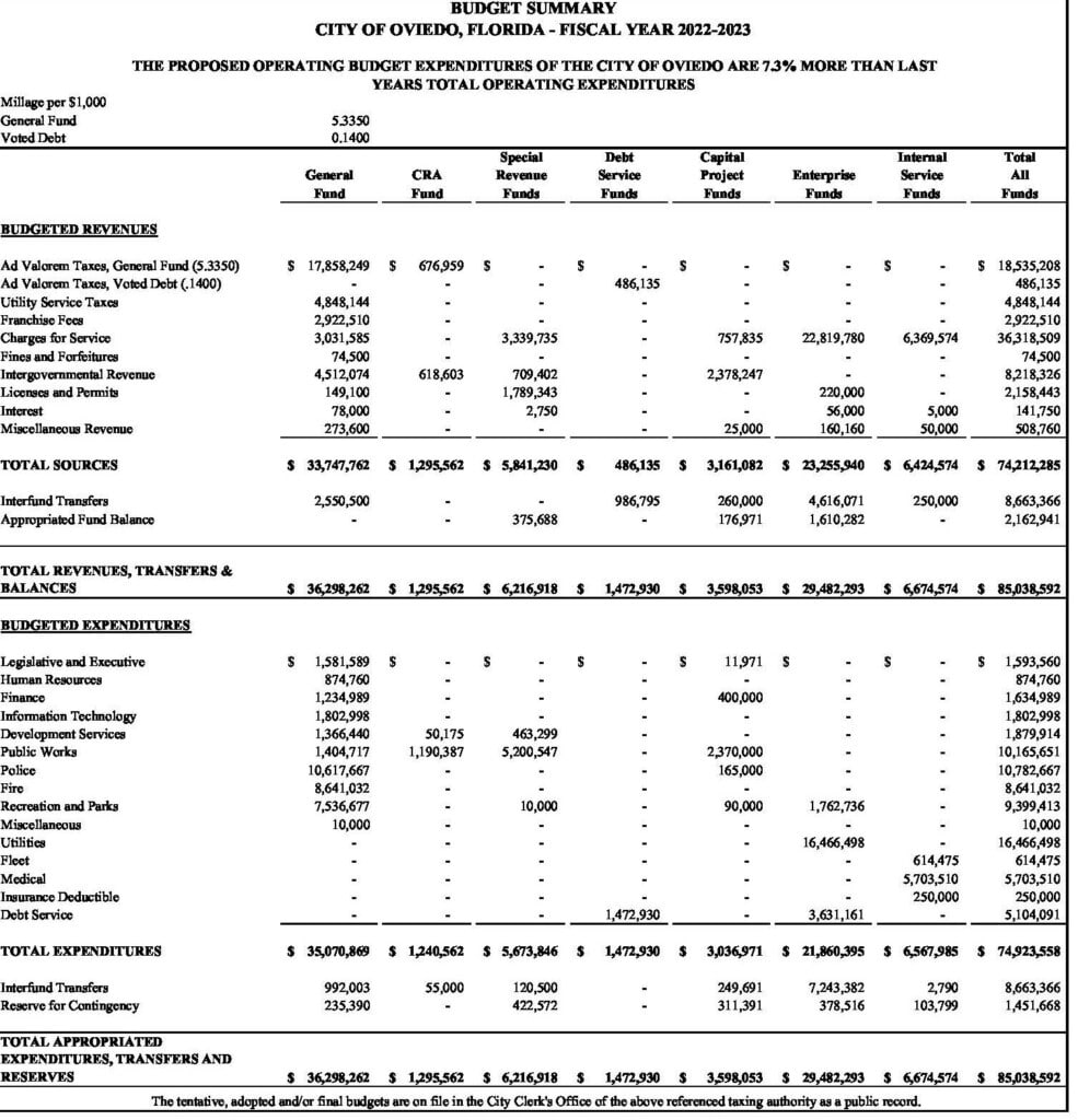 - A $1.2 million increase in operational expenses, from $6.8 million last year to $8 million this year, which Oviedo Assistant City Manager Patrick Kelly said is largely driven by increased costs due to inflation.