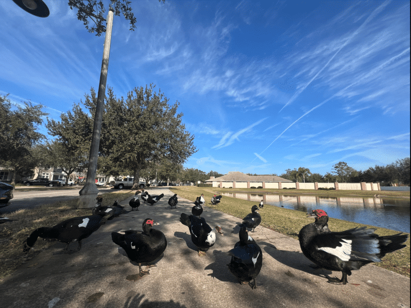 A large team of Muscovy ducks has made itself at home in Oviedo, congregating in a retention pond, sidewalks and streets near and around the intersection of Oviedo Boulevard and Windy Pine Way.
