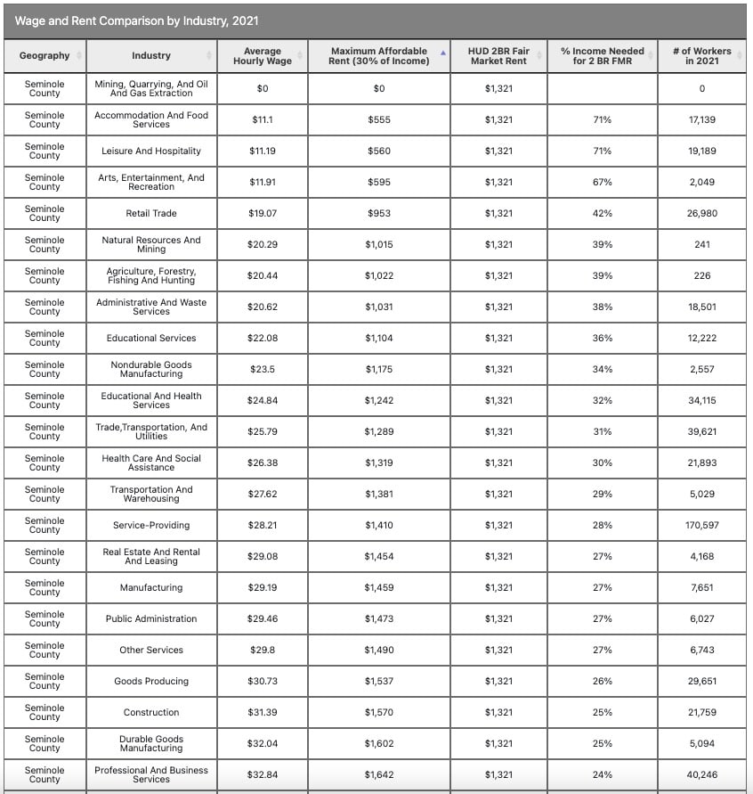 Of the 29 industry categories counted in the data, based on the average hourly wage, individuals in 12 – including accommodation and food service, leisure and hospitality, retail, educational and health services, trade, transportation, and health care and social assistance – would be unable to afford the fair-market two-bedroom rent. Individuals in 10 additional industries, ranging from construction, real estate, manufacturing, public administration and service-providing industries, would be unable to afford the median monthly mortgage in Seminole County.