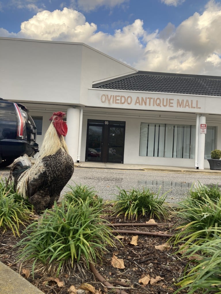 The free food pantry at Chuluota Grocery store. Items such as diapers, canned goods, fresh eggs and bread are stocked in this small pantry for neighbors to use when needed. Oviedo’s free-roaming chickens, frequenting different Oviedo spots, including the Post Office, the East Branch Library and the Town House Restaurant. Also, the people who leave food and water out for them.