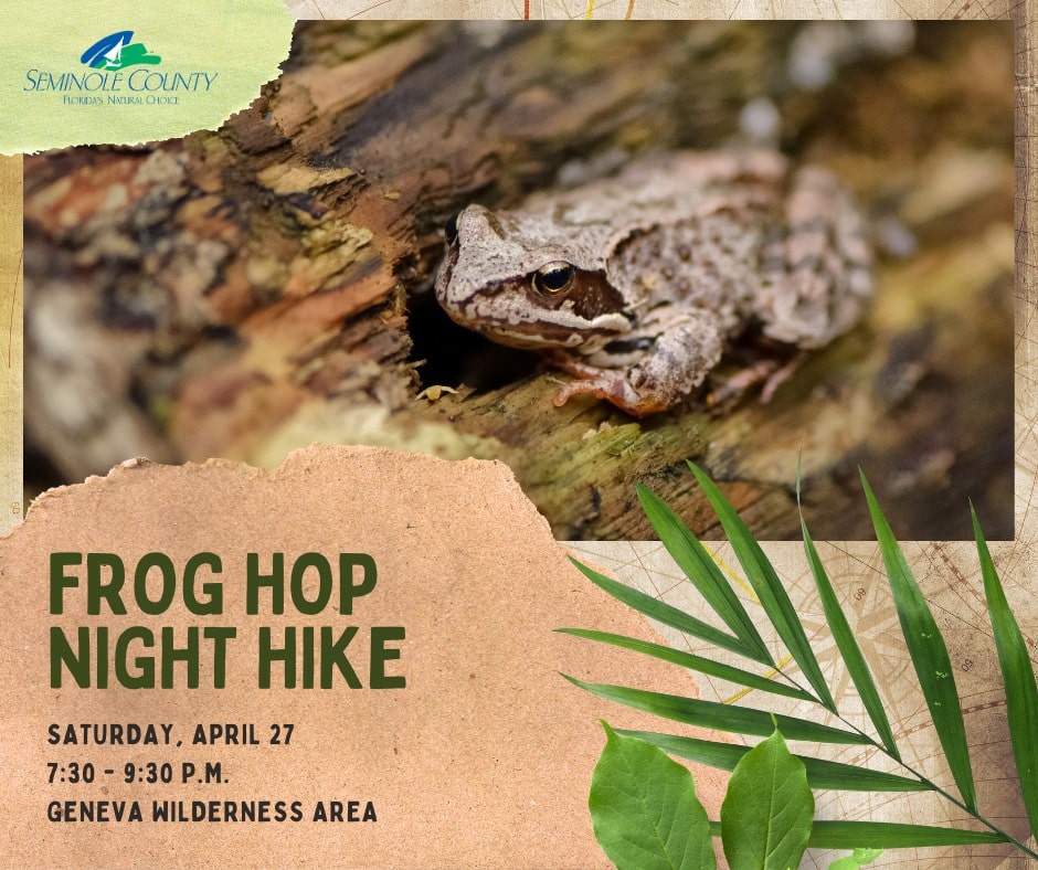 Participate in a Frog Hop Night Hike from 7:30-9:30 p.m. Saturday, April 27 at Geneva Wilderness Area, 3485 N. C.R. 426. The guided hike explains how to identify frogs and teaches participants about the science connected to them. The event is for ages 7 and older and costs $5. Learn more.
