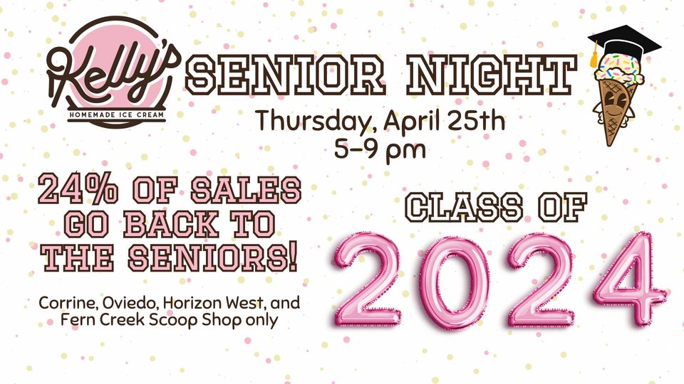Bring your high school senior to Senior Night from 5-9 p.m. Thursday, April 25 at Kelly’s Homemade Ice Cream, 119 N. Central Ave., Suite 1007, in Oviedo. 24% of sales go back to high schools in the area. Learn more.