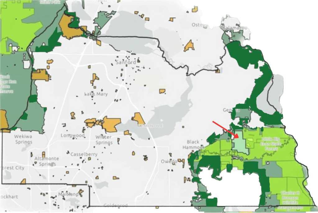 All of the green is land in the Wildlife Corridor. The bright green is land protected through entities such as Florida Forever, while the darker green is not. Seminole County is shown with the black border. For scale, the pale green cutout in the east (indicated with red arrow) is the 1,361 acres of Yarborough Ranch recently acquired by Florida Forever. (Map by Ana Orvieto, GIS analyst)