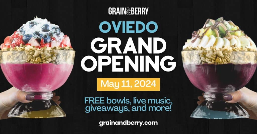 Try Grain & Berry Oviedo at their grand opening event at 9 a.m. Saturday, May 11 at 1121 Alafaya Trail, Suite 1027, in Oviedo. There will be free bowls, live music and giveaways. Learn more.
