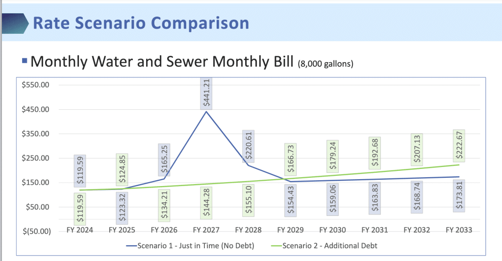If the city took the route of borrowing nearly $10 million to fund the project, the stormwater rate would still increase, but not as quickly, rising to $13.79 in 2025, then $16.55 in 2026, and $19.03 in 2027. But the lower initial increases would eventually give way to higher stormwater rates for the financed plan in 2033 and beyond.