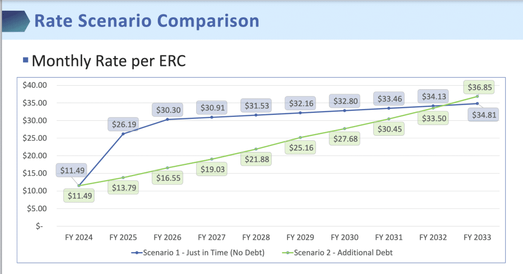 “The individual citizens pay all this money up front but they don’t get that value back if they leave,” Pollack said. “That’s why you use the debt to levelize these rates, so that you don’t have a 120-something percent rate impact in your first year. I think this is a much more fair approach to residents.”