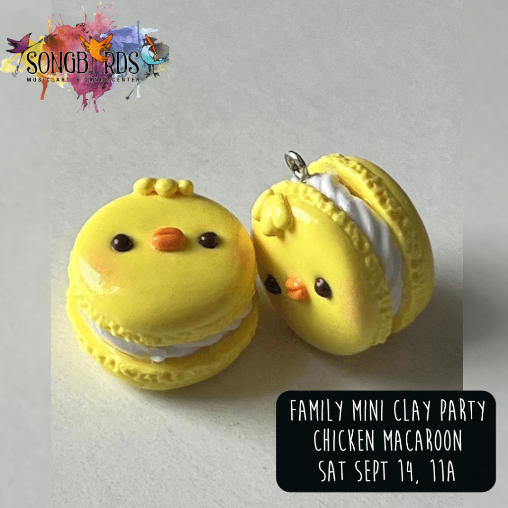 Create your own mini clay chicken macaroon at a family mini clay party from 11 a.m. to 12:30 p.m. Saturday, Sept. 14 at Songbirds Music, Art, & Dance Center, 181 E. Mitchell Hammock Road in Oviedo. Tickets cost $20. Learn more.