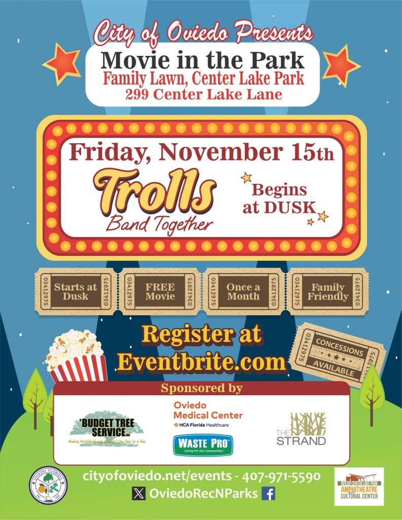 Enjoy the City of Oviedo’s movie night, featuring “Trolls-Band Together,” from 5-9 p.m. Friday, Nov. 15 at Center Lake Park, 299 Center Lake Lane. There will also be vendors, swan paddle boats and a concession stand. Learn more.