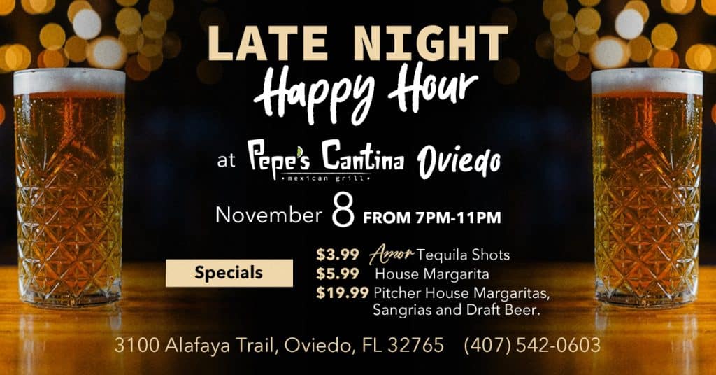 Treat yourself after a long week with Late Night Happy Hour at Pepe’s Cantina Oviedo from 7-11 p.m. Friday, Nov. 8 at 3100 Alafaya Trail. Learn more.