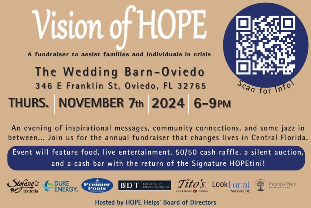 Take part in Vision of HOPE, a fundraiser to assist families and individuals in crisis from 6-9 p.m. Thursday, Nov. 7 at The Wedding Barn, 346 E. Franklin St. in Oviedo. There will be a cash bar, a raffle, silent auction and a buffet from Stefano’s Trattoria. All proceeds benefit HOPE Helps’ programs. Learn more.
