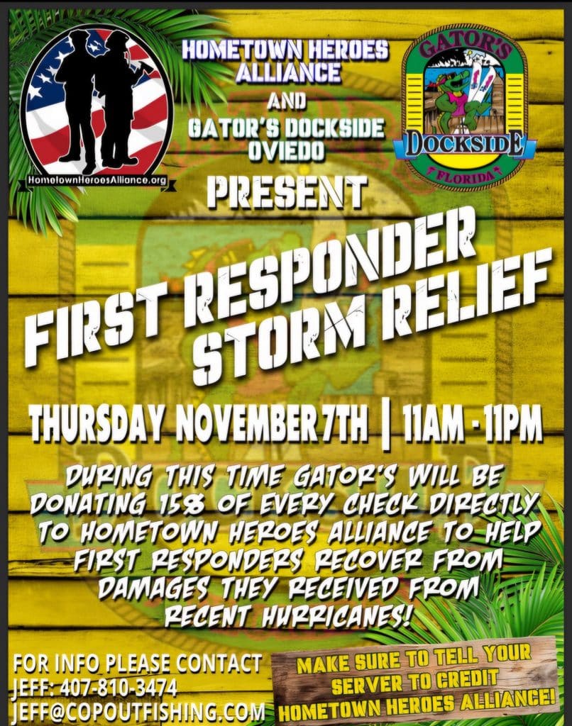 Head to Gator’s Dockside Oviedo for the Hometown Heroes First Responder Storm Relief Initiative Benefit from 11 a.m. to 11 p.m. Thursday, Nov. 7 at 167 E. Mitchell Hammock Road Learn more.