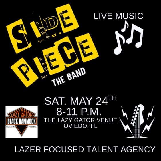 Rock out to Side Piece, coming to the Lazy Gator this Saturday. They bring a country and rock sound from Ocala. It’s from 8-11 p.m. Saturday, May 24, at The Lazy Gator, 2316 Black Hammock Fish Camp Road, Oviedo. Learn more.