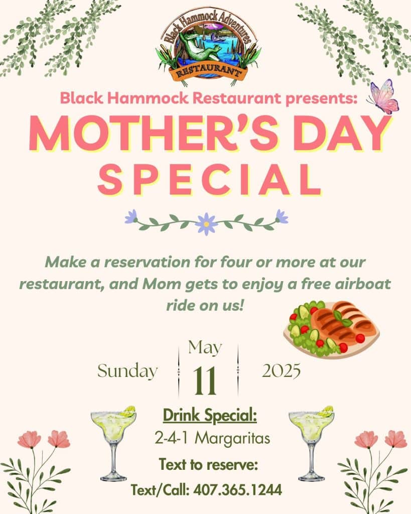 Treat mom to a lakeside dining experience, and maybe an airboat ride through famous Lake Jesup, this weekend. Book four airboat rides and mom gets to ride for free, plus a special Mother’s Day menu and drink specials. It’s at The Black Hammock, 2316 Black Hammock Fish Camp Road, Oviedo. Learn more.