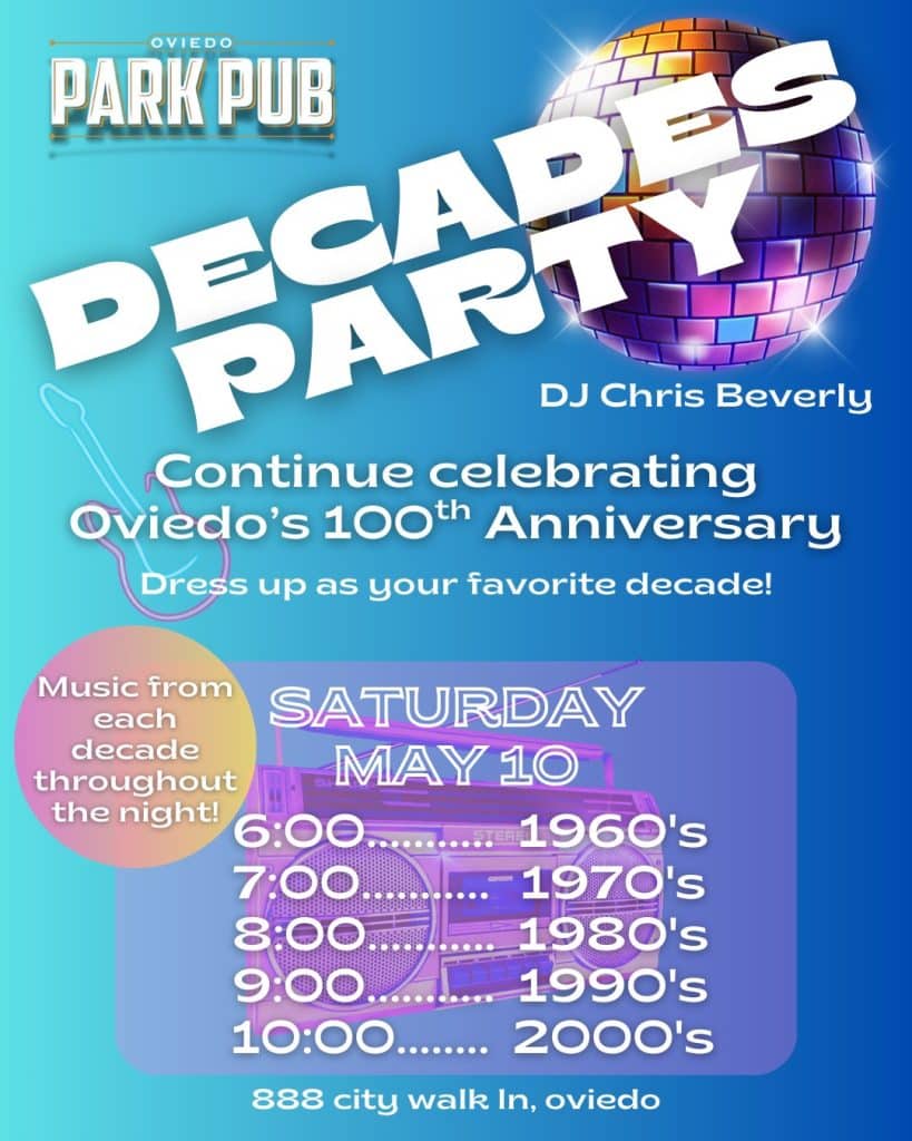 Keep the celebration of 100 years of Oviedo going with Oviedo Park Pub’s Decades Party with DJ Chris Beverly. Starting with the ‘60s at 6 p.m., each new hour counts up a new decade of music. Bonus points for dressing like your favorite decade. It starts at 6 p.m. Saturday, May 10 at Oviedo Park Pub, 888 City Walk Lane, Oviedo. Learn more.