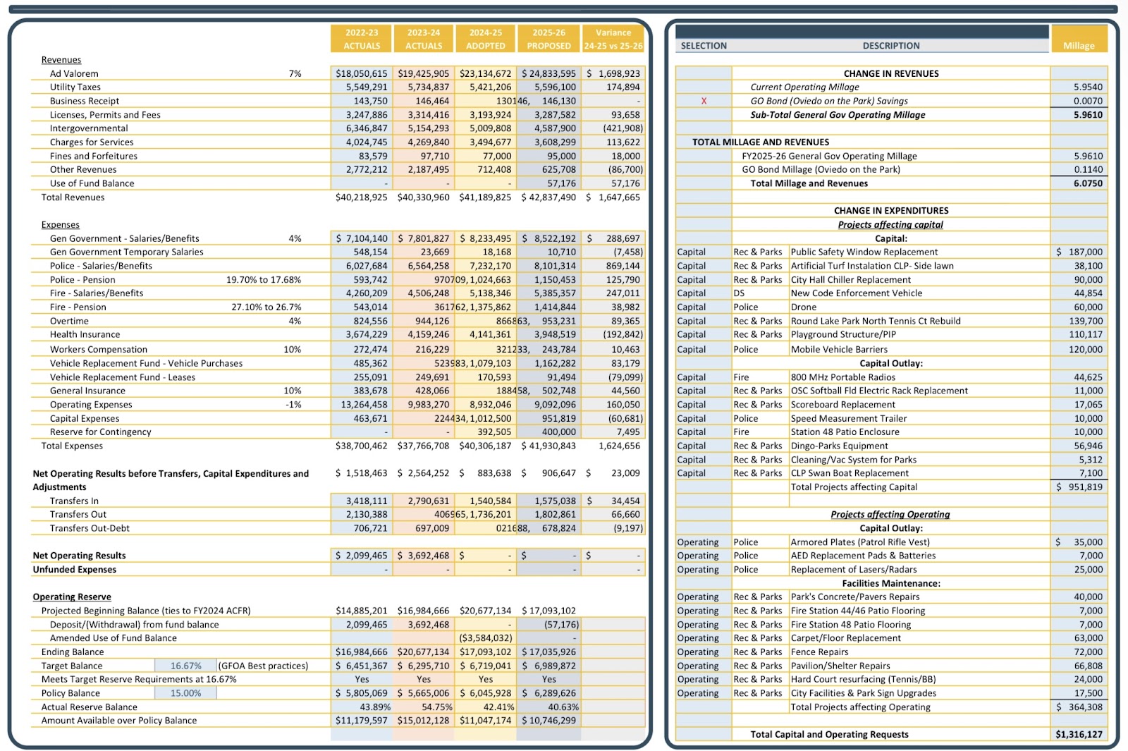 Oviedo’s proposed 2025-26 general fund budget includes $43 million in total revenue and $42 million in total expenses, with a projected $17 million in operating reserves, which is similar to the last three budgets.