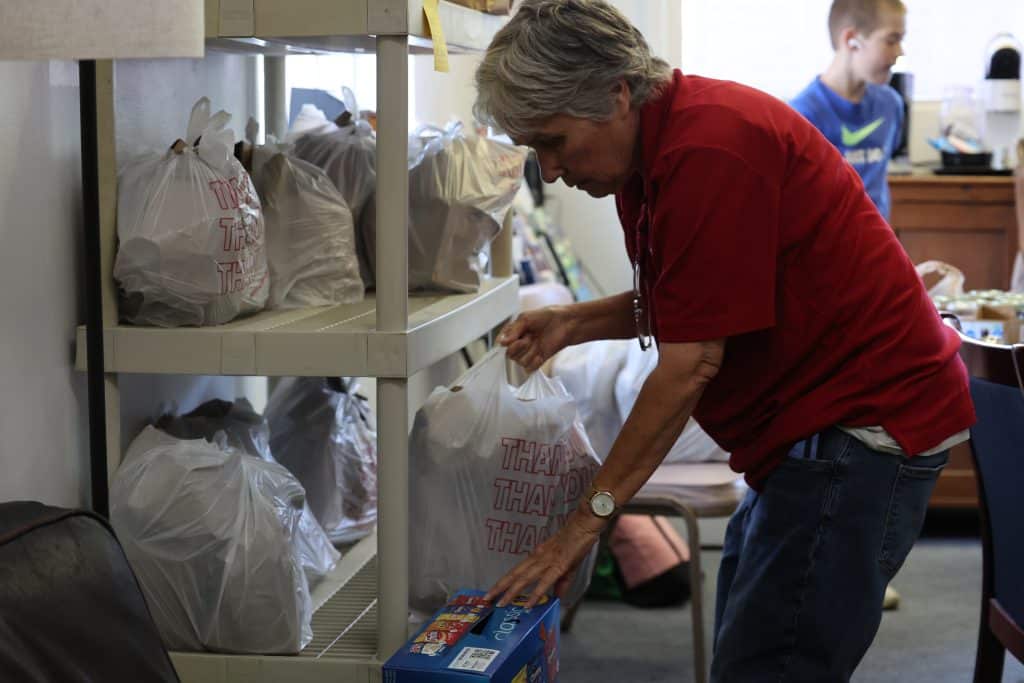 Staff and volunteers pack bags with six days’ worth of food, ready for pickup on Saturdays. The food items included are primarily non-perishable to make packing and distribution easier, Barbie said. The Center does have weeks when families take home items that are perishable, including frozen pizza, salad, sausage and eggs.
