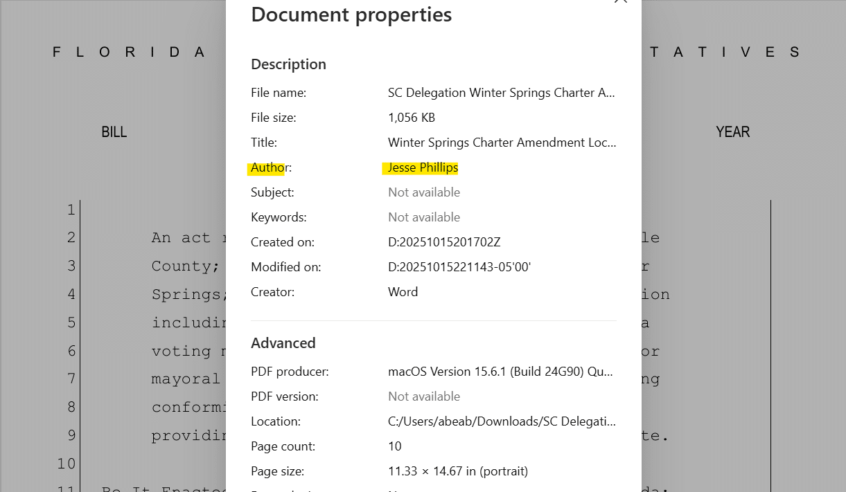 Metadata is information stored in a file showing data like who was the author and when modifications were made. Metadata can be edited, though simply forwarding an email would not change the document’s metadata. Phillips has previously taken credit for documents created and submitted to the state’s Joint Legislation Audit Committee about Winter Springs.