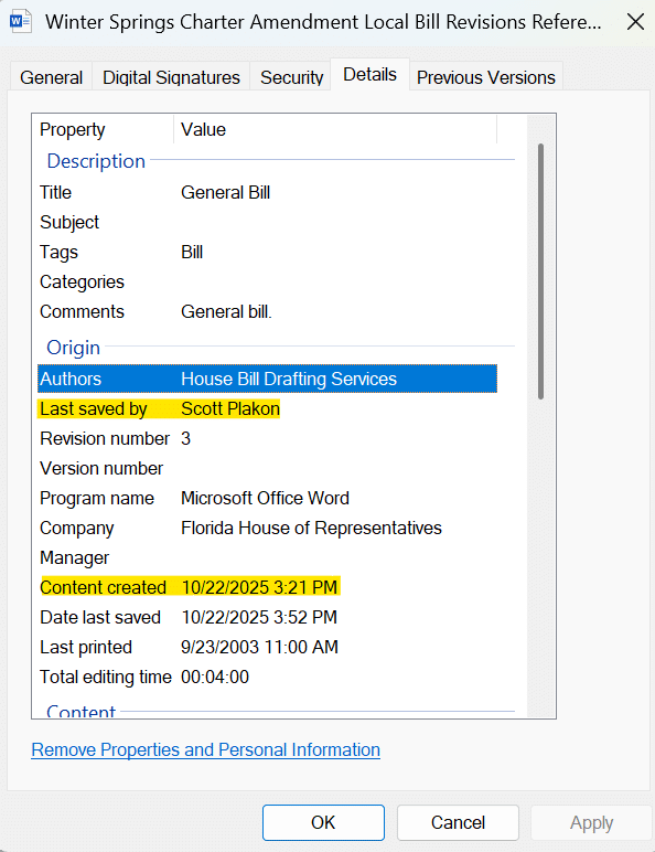 The bill Plakon sent was created in the afternoon on Oct. 22 – less than 24 hours before the vote took place, according to the metadata on the document. The key difference between this version and the previous one reviewed by Oviedo Community News is the addition of a referendum component.