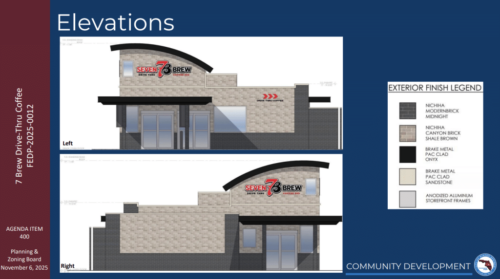 Staff is recommending approval of the 7 Brew Drive-Thru Coffee, located at 1248 E. S.R. 434. It’s at the northeast corner of the intersection of S.R. 434 and Michael Blake Boulevard, in the same development as The Learning Center, a planned daycare, and a possible 82-townhome development known as The Sea Hawk Cove.