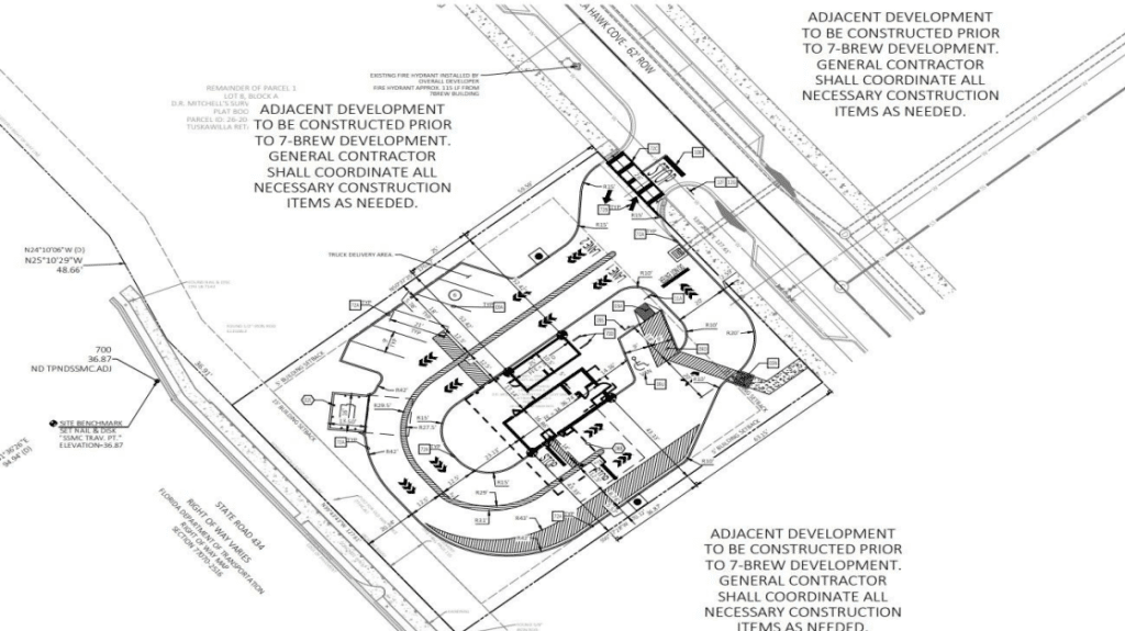 - A waiver to allow 7 Brew Drive-Thru Coffee to be located farther away from S.R. 434, at a setback of 68 feet instead of the 50-foot maximum front setback.