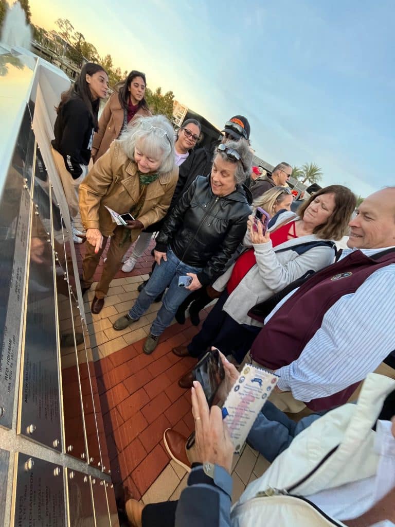 The flag above the Oviedo Veterans Tribute hung at half-staff on Nov. 11, moving lightly in the cool evening breeze as the sunset reflected pink and orange off of Center Lake. Veterans from different eras stood in small groups, some in uniform with medals, others in plain clothes, resting on walkers or canes. Families filled the space with children playing off to the side and relatives of all ages finding places to stand as the start time approached. The crowd grew steadily, quieting as people prepared to hear the 34 names that would be added to the tribute wall.