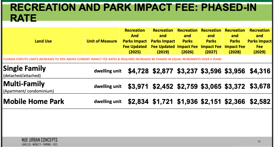 “The proposal here is to charge the highest amount we are allowed to under Florida law, which when you hear about this phasing in, we’re not allowed to just hop right away to what we have mathematically calculated the actual impact will be,” Sladek said. “So we are doing our very best up here to accelerate the speed at which we do these studies and hop our impact fees to the right place.”