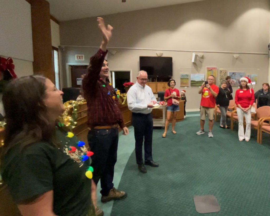 City Manager Bryan Cobb, who’s served on Oviedo’s city staff for more than two decades, was mid-conversation, and mid-bite, over near the mayor’s seat when the clock struck 3:45 p.m., All talk stopped suddenly, overwhelmed by singing that burst spontaneously from the front of the room, first one voice, then two, then 10. “We Wish You a Merry Christmas” did a speedrun through just one chorus before the clock ran out. Just enough time to race to grab one more cookie with snowman icing on top.