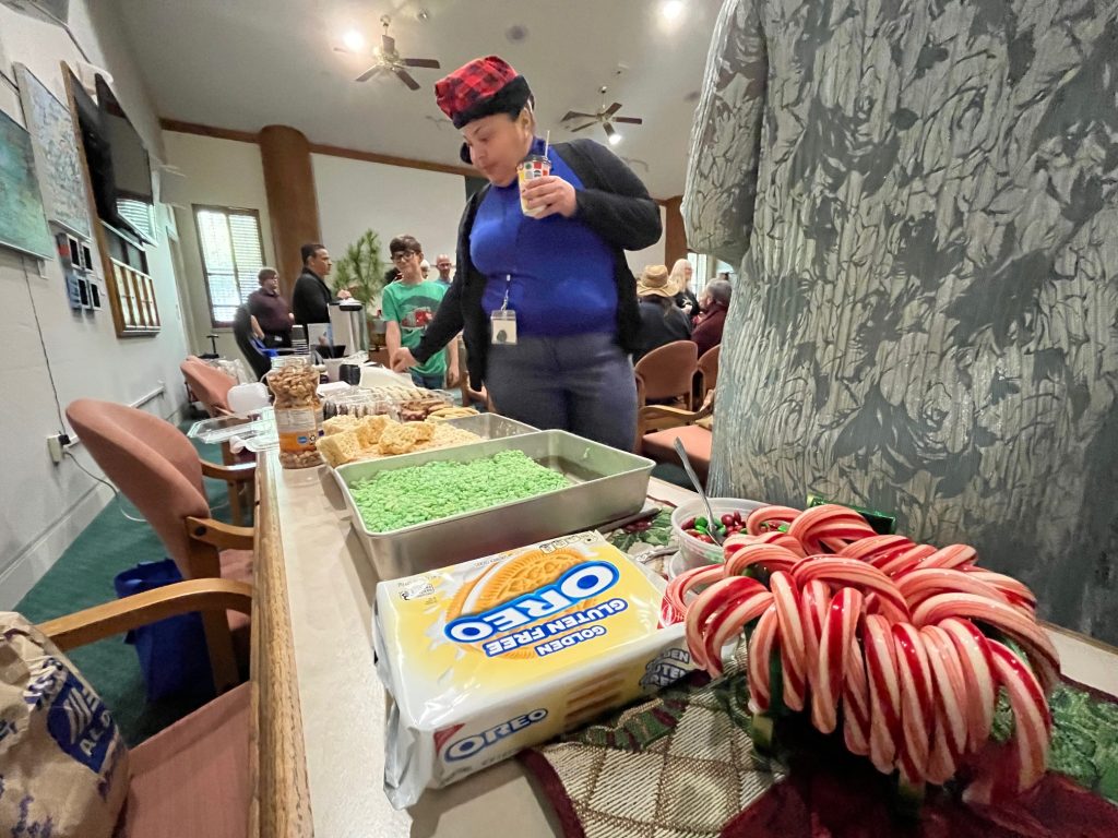 The clock was ticking. With 13 minutes left until party time, the frilly gold garlands, ornaments and stuffed festive creatures were lining up on dais wood. The water in the big electric thermos was heating up as a lady with graying brown hair and a sweater with some sort of red horned animal on the front, part moose, part deer, quietly sauntered in and sat down in a chair. She was early. Too early. This party might be for anybody who wants to come, but it isn’t for early people.