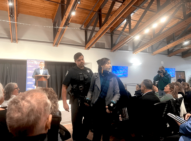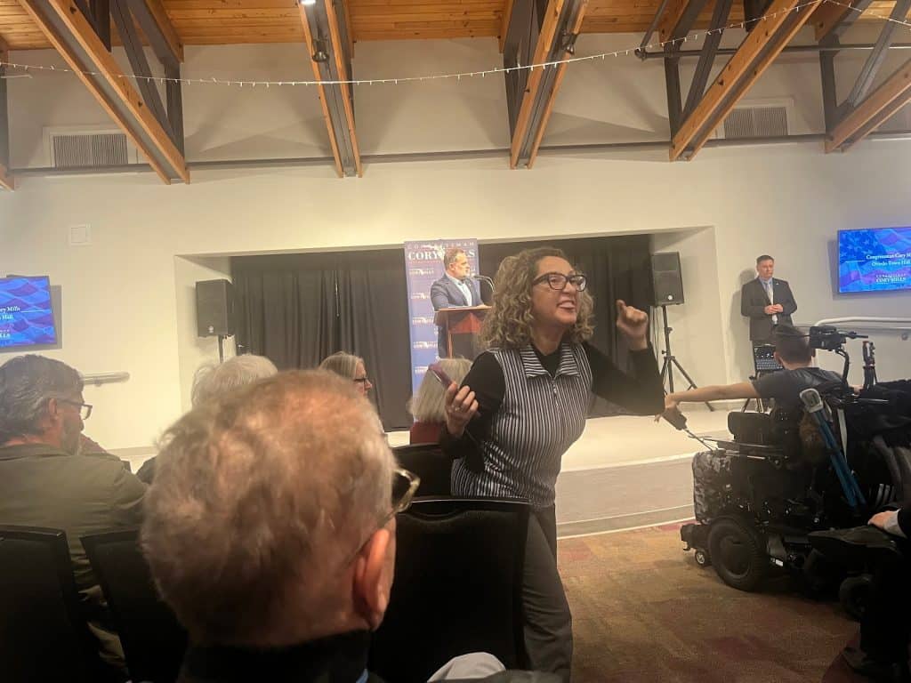 “The best part about yelling over is no one hears the questions, and we want people to hear your concerns,” Mills said as staffers surrounded Andrade, asking her to leave. “If the lady would like to stay and listen, you’re more than welcome to stay.”