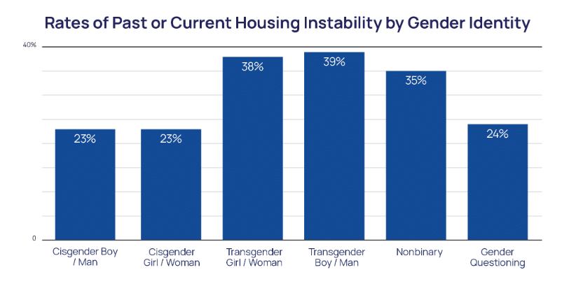 A 2023 CDC survey found that 26% of transgender students attempted suicide in the past year, while 5% of cisgender male and 11% of cisgender female students did the same. Another survey by the Trevor Project found that 38% of transgender girls, 39% of transgender boys and 35% of nonbinary youth had experienced or were experiencing homelessness or housing instability.