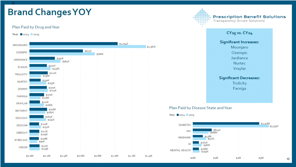 The School Board is currently grappling with significant budget shortfalls. The overall cost to the school board for brand-name diabetes medications went up from $1.3 million in 2024 to about $7 million in 2025. The changes in that were mostly due to the diabetes cost, which increased mainly because of the GLP-1 medications.
