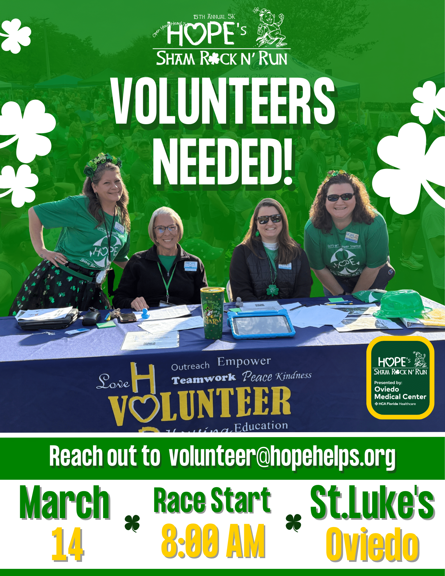 HOPE Helps, Inc's mission is to prevent and reduce hunger and homelessness in Seminole County. On March 14th, 2026, we are hosting a St. Patrick's themed family fun run fundraiser to support our programs. Volunteers are needed for setup day and the day of the event. Help us make this 15th annual Sham Rock N' Run a success!